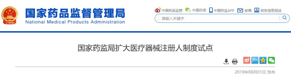 為深入貫徹落實中共中央辦公廳、國務(wù)院辦公廳《關(guān)于深化審評審批制度改革鼓勵藥品醫(yī)療器械創(chuàng)新的意見》(廳字〔2017〕42號)精神,加快推進醫(yī)療器械產(chǎn)業(yè)創(chuàng)新發(fā)展,在前期上海、廣東、天津自貿(mào)區(qū)開展醫(yī)療器械注冊人制度試點工作的基礎(chǔ)上,今日,國家藥品監(jiān)督管理局(以下簡稱國家局)發(fā)布《關(guān)于擴大醫(yī)療器械注冊人制度試點工作的通知》(國藥監(jiān)械注〔2019〕33號,以下簡稱《通知》),進一步擴大醫(yī)療器械注冊人制度試點,為全面實施醫(yī)療器械注冊人制度進一步積累經(jīng)驗。