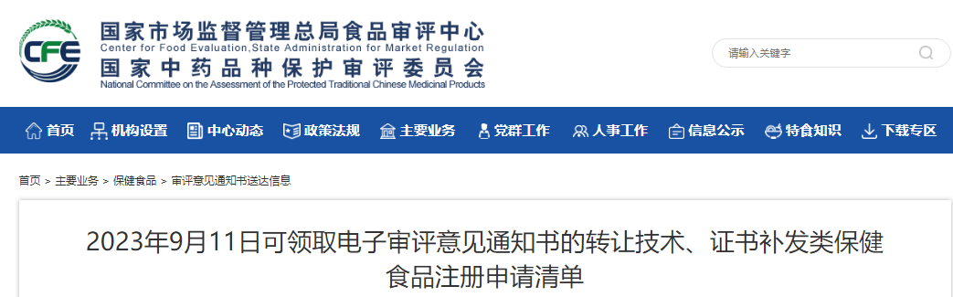 2023年9月14日可領(lǐng)取電子審評意見通知書的變更注冊、轉(zhuǎn)讓技術(shù)、證書補發(fā)類保健食品注冊申請清單